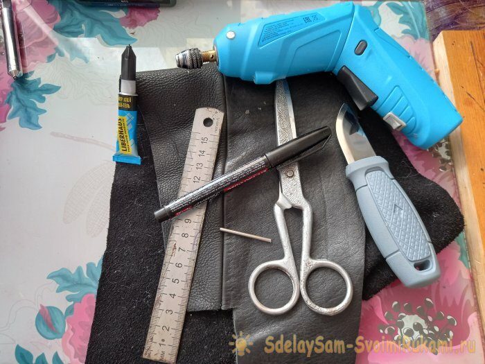 Дрель и тонкая трубочка с заточенными краями, для вырезания отверстий в коже.