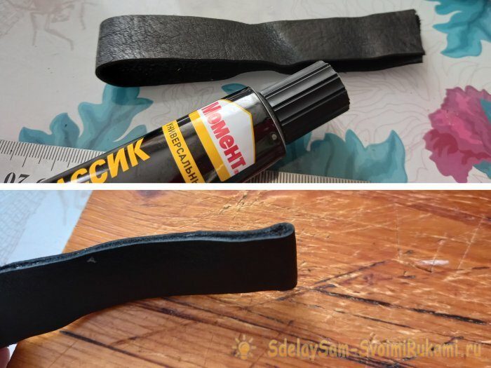 Складываем полоску пополам, отмечаем маркером середину, смазываем шершавую сторону клеем для кожи, и плотно прижимаем сложенную пополам полоску на несколько минут. На середину, в поперечнике, миллиметров пять, клей не наносим, чтобы осталось пространство для шпильки. Вот так должно получиться:
