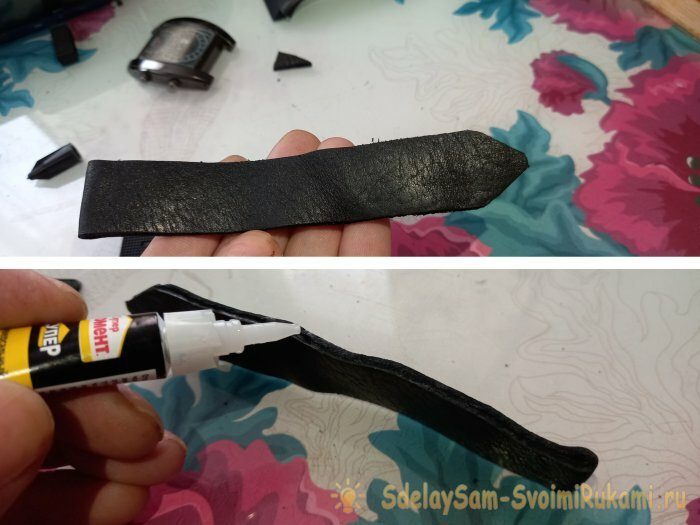 Загибаем ремешок с одного края на 2-3 сантиметра. Делаем на сгибе, посередине, отверстие. Продеваем в него язычок пряжки. Продеваем ремешок в пряжку, и склеиваем. Вот так: