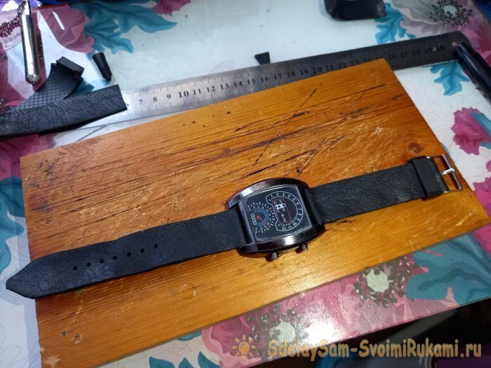 При помощи дрели или молотка, пробиваем отверстия в ремешке, по нарисованным меткам. Примеряем застежку.