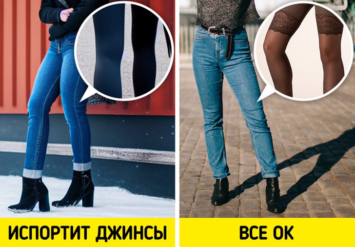 Собственный комфорт и тепло важнее любых правил и предрассудков. Но все же есть смысл прислушаться к одному из практичных советов: не стоит носить под джинсами плотные легинсы или, хуже того, спортивные штаны, чтобы было теплее. И то и другое может привести к тому, что джинсы растянутся и станут велики.