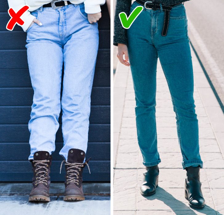 Джинсы с незауженными штанинами плюс высокие сапоги с широким голенищем не лучшее сочетание. Красиво засунуть штанины в обувь не так-то просто. Скорее всего, ткань соберется в гармошку, одежда будет выглядеть неряшливо, а ноги начнут казаться более массивными, чем есть на самом деле.