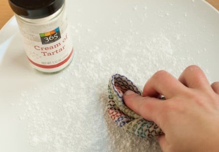 Не спешите выбрасывать поцарапанные тарелки, ведь их еще можно спасти. Винный камень справится даже с глубокими повреждениями. Возьмите блюдо, присыпьте его белым порошком, добавьте немного воды (буквально несколько капель) и потрите влажной салфеткой. Оставьте вещество на пару минут, а после промойте посуду с моющим средством.