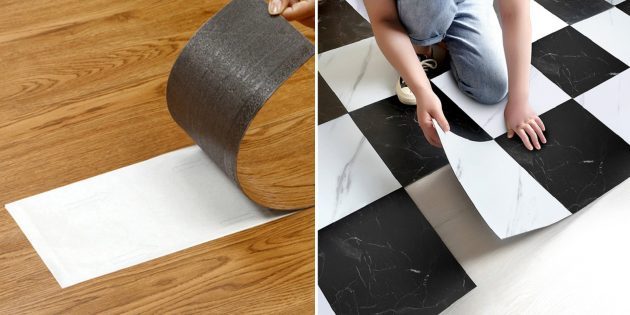 Износостойкие панели укладываются прямо на старое покрытие — главное, чтобы оно было чистым и гладким. Дизайн можно подобрать на любой вкус: есть изделия с имитацией дерева, паркетной кладки или керамической плитки с узорами. Ещё один способ декора пола — наклейки для кафеля. Они не боятся воды и подойдут для ванной комнаты.