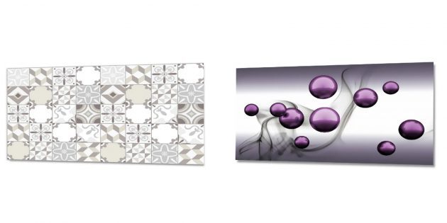 Главное преимущество такого фартука — простой монтаж. Изделие крепится на «жидкие гвозди» — универсальное средство, нанесение которого не требует особых навыков. Фартук будет защищать стены от брызг масла и воды, а также привлекать внимание ярким дизайном. К примеру, принтом с пёстрыми цветами или городским пейзажем. Если предпочитаете более классические варианты, присмотритесь к рисункам с имитацией плитки или кирпичной кладки.