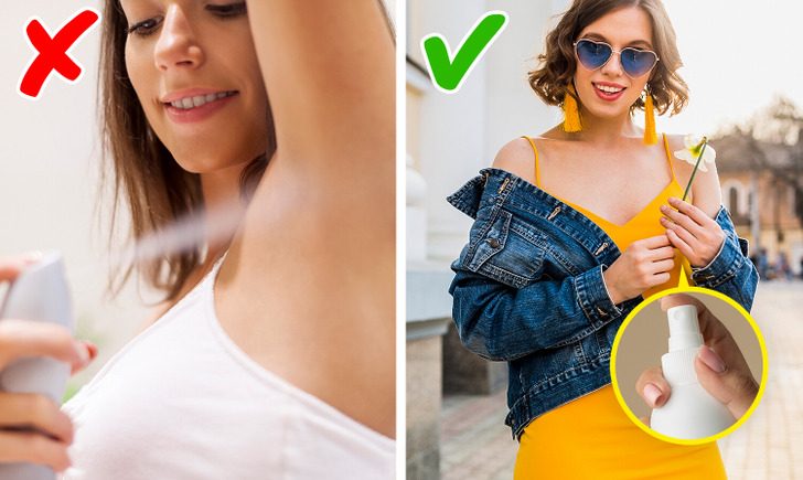 Реклама научила нас использовать антиперспирант строго для зоны подмышек. Но это вовсе не обязательно. Твердый дезодорант или спрей стоит наносить на ту зону, которая в этом особо нуждается. Например, на спину, если она склонна к потливости, или под грудь. Главное при выборе средства обращать внимание на его состав: антиперспирант не должен содержать алюминий и парабены.