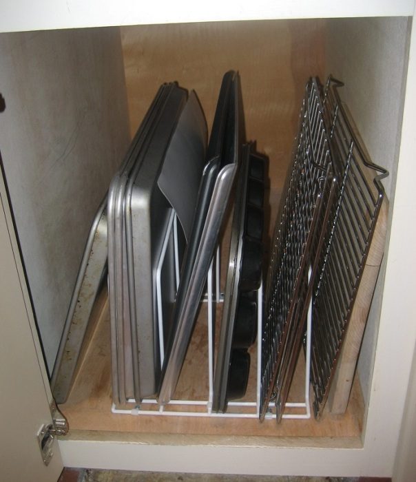 Обычно, плоские предметы по типу разделочных досок и противней хозяйки складывают в ящик или шкафчик друг на друга. Это привычка, которая передается из поколения в поколение, но ничего, кроме неудобства не несет. Во-первых, сложно найти нужный девайс, а во-вторых, по закону подлости, он оказывается в самом низу под кучей других тяжелых предметов.