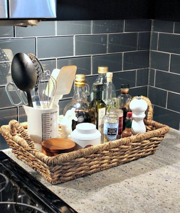 Дизайнеры часто советуют максимально разгружать столешницу, чтобы не было визуального шума, и кухня не выглядела перегруженной. Однако в реальной жизни редко получается прислушиваться к этой рекомендации. У каждой хозяйки есть ряд вещей и продуктов, которые необходимо постоянно держать под рукой. Мы говорим о соли, сахаре, растительном масле, соусах, ложках, вилках и пр. Каждый раз доставать их из шкафчика и ставить обратно неудобно + отнимает драгоценное время. Как же поступить в этой ситуации?