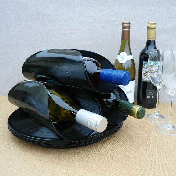 Ненужные виниловые пластинки можно превратить в красивую бутылочницу, которая станет эксклюзивным украшением кухни.
