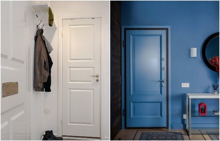 Чтобы входная дверь не перетягивала на себя внимание, не выбивалась из общей картинки и не создавала визуальный шум, ее можно покрасить в цвет стен. В этом случае такого же оттенка должны быть дверные откосы, порожек и домофон. Еще один любопытный вариант – сделать на белых стенах в коридоре широкую горизонтальную полосу, которая будет проходить и через дверное полотно. Такая картинка выглядит очень интересно и оригинально, при этом входная дверь все равно останется практически незаметной.