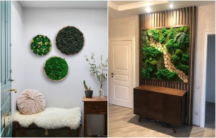 Комнатные растения в прихожей можно увидеть достаточно редко, так как в комнате нет окон, а, соответственно, и естественного освещения. Немногие цветы согласны на подобные условия содержания, так как большинство растений нуждаются в прямом воздействии солнечных лучей. Вместе с тем живые цветы делают интерьер более свежим, легким и уютным. Выходом из ситуации может стать оригинальное панно из стабилизированного мха. Его не нужно поливать и держать на подоконнике – наоборот, он боится прямых солнечных лучей, а влажность воздуха должна быть не менее сорока процентов.