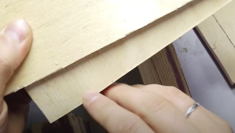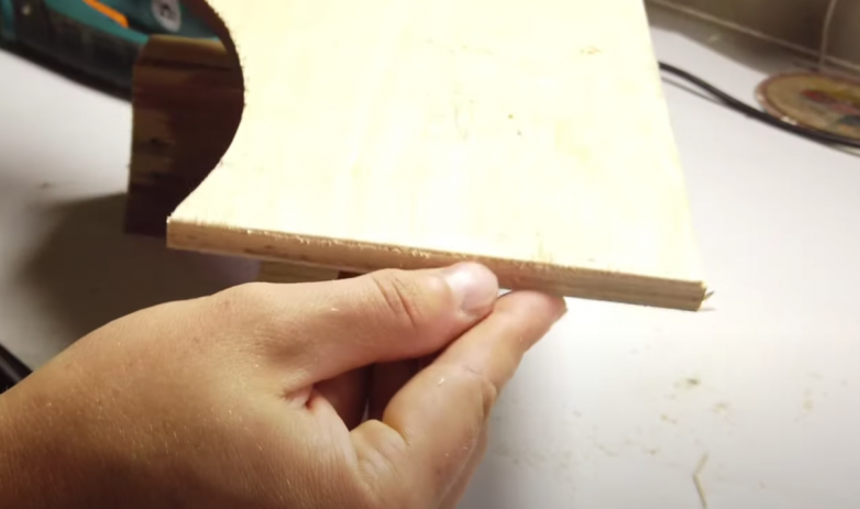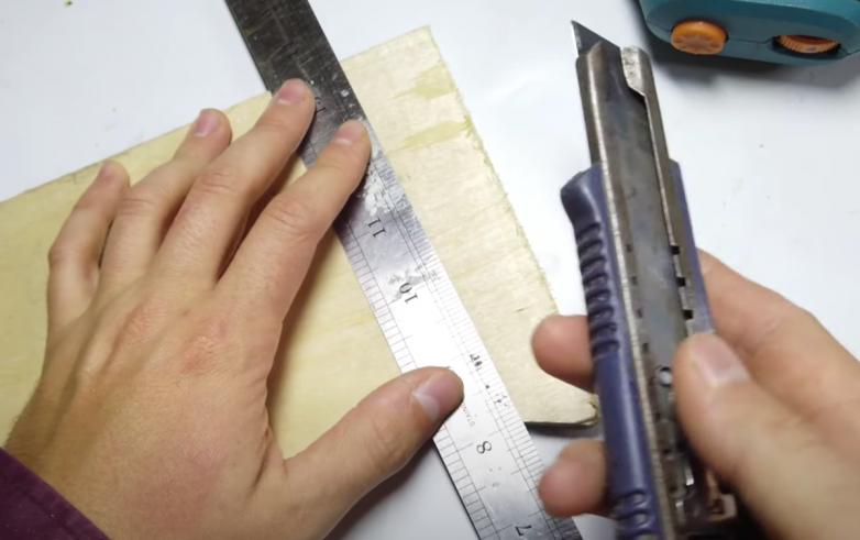 Следущий вариант максимально простой. Но требует сноровки. Нам нужно слегка надрезать верхний слой фанеры с помощью канцелярского ножа. А затем уже пилить фанеру непосредственно по самому разрезу.