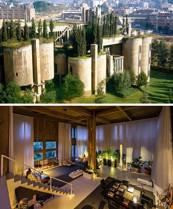 Известный испанский архитектор Рикардо Бофилл, бюро которого разработало более 1 000 проектов в 56 странах мира, почти 45 лет живет и работает в здании бывшего цементного завода. Промышленный объект, заброшенный еще в начале ХХ века, состоит из 30 элеваторов, подземных галерей и машинного отделения. В 8 башнях архитектор обустроил библиотеку, проектные мастерские, макетную лабораторию, архив и выставочное пространство, которое из-за огромных арочных окон назвали «Собор». Грубые бетонные стены, висячие сады и узкие лестницы прекрасно подошли для работы модной архитектурной мастерской. Такой объект стоит один раз увидеть, ну хотя бы на фотографиях.
