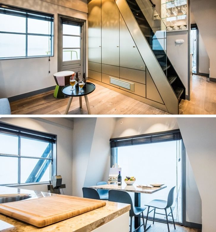 В Амстердаме специалисты компании Studio Edward van Vliet превратили заброшенный портовый кран, которым когда-то грузили уголь, в элитную 3-этажную квартиру площадью 40 кв. м. Для этого внутри каркаса крана разместили 3 контейнера, сложенных друг на друга, и оборудовали там жилые комнаты. На 1-м этаже квартиры-крана расположили гостиную, кухню и столовую зону, на 2-м — спальню и ванную комнату, а на 3-м — еще одну спальню, с панорамным окном, из которого открывается вид на реку Эй.