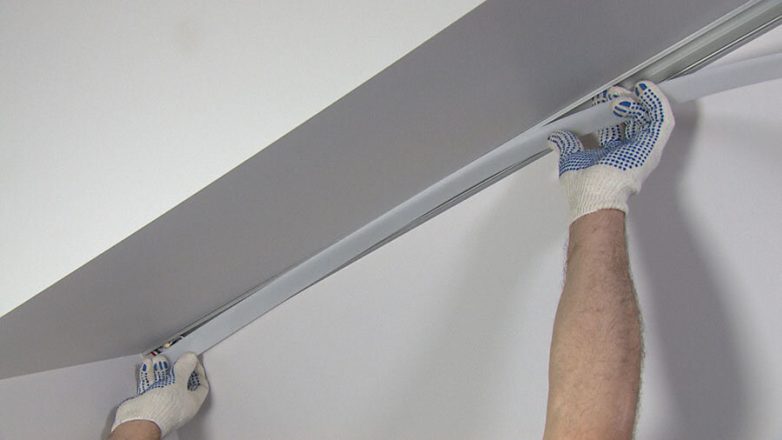 Этап 6. Выполняется стандартная установка натяжного потолка, которая начинается с углов, а после прогрева пленки и помещения, продолжается по стенам. Гарпун полотна равномерно вводится в паз алюминиевого профиля лопаткой, выравниваются возможные деформации по линии крепления.