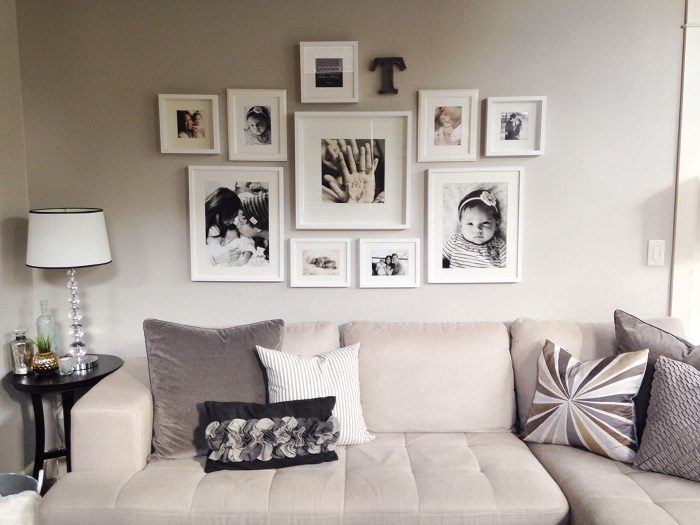 Отлично с этой задачей справятся стены. Смело можете развесить на них фотографии в рамках, детские рисунки, постеры, картины любимых художников. Также можно добавить полочки с цветами или сувенирами, привезенными из разных стран, подвески и браслеты, которые важны для вас. Уместно будут смотреться даже музыкальные инструменты, если вам близка эта тема. Такая стена будет напоминать калейдоскоп и пробуждать радостные эмоции при каждом взгляде на нее.