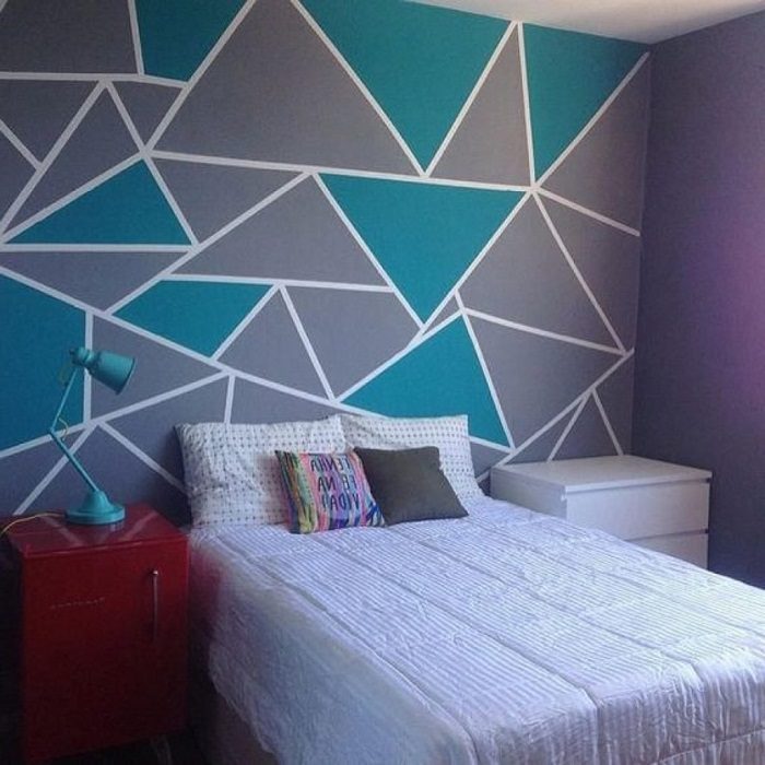 Раньше крашенные стены считались элементом государственных учреждений: школ, больниц, офисных помещений. К счастью, этот стереотип давно в прошлом, поэтому дизайнеры активно используют краску разнообразных цветов для оформления квартир. Если стандартное однотонное оформление не вдохновляет, можно придумать вариант получше. Например, использовать геометрическую роспись, которая не только добавит интерьеру уникальности, но также придаст комнате дополнительный объем. Кстати, различные геометрические рисунки можно создать не только краской, но также цветным скотчем. Главное – наклеить его без заломов по заранее продуманному плану. Этот прием намного хитрее, чем кажется на первый взгляд. Если у вас маленькая кухня и обеденный стол лишь подчеркивает тесноту помещения, активная графика на стене отвлечет внимание и визуально сделает пространство больше.