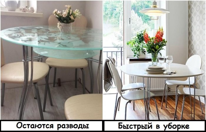 Этот предмет мебели часто советуют покупать дизайнеры, аргументируя свою позицию тем, что стеклянный стол выглядит намного легче, не загромождает пространство и визуально занимает меньше места. Данные утверждения действительно являются правдивыми, однако нельзя забывать и о другой стороне медали. В частности, на стеклянной поверхности постоянно остаются разводы, ее недостаточно протереть обычной влажной тряпкой, чтобы привести в порядок. Иногда кажется, что стол в идеальном состоянии, однако стоит на него взглянуть под другим углом или при освещении люстры, как разводы сразу становятся заметными.