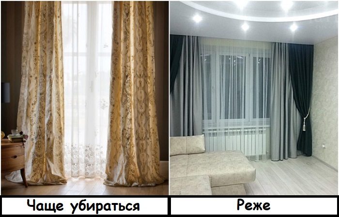 Еще один совет от дизайнеров – вешать удлиненные шторы, которые визуально приподнимают потолок, создают эффект утонченной небрежности за счет красивого объема ткани, а также позволяют скрыть неровности пола и неправильную форму окон. Звучит отлично, однако, когда дело доходит до практичного использования, становится грустно. Длинные шторы быстро пачкаются, требуют частой стирки, особенно если в квартиры живут коты или собаки. Также они будут неуместны в комнатах, где мебель стоит вплотную к окну, так как в этом случае все их положительные свойства сводятся на нет.