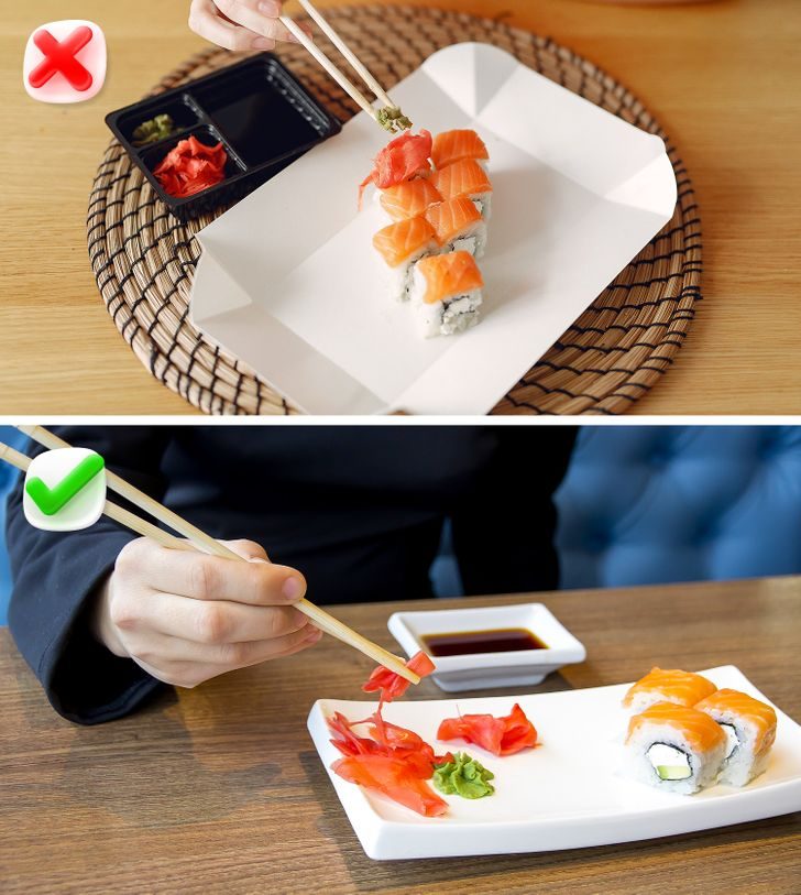 Многие предпочитают класть имбирь на ролл и только после этого отправляют лакомый рулетик в рот. На самом деле маринованный имбирь за счет своей свежести и жгучести помогает вкусовым рецепторам очиститься от привкуса предыдущего ролла. Эту добавку стоит есть отдельно, после каждого ломтика.