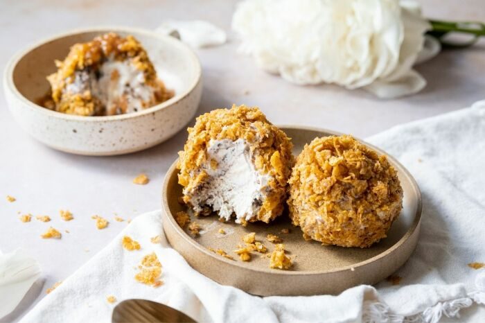 Помимо классического мороженного, которое можно есть в холодном виде, стоит приготовить и… жаренное. Классический пломбир, покрытый стружкой от мякоти кокоса и сдобренный панировочными сухарями, заиграет совсем иными красками.