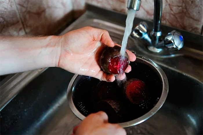 Итак, вам нужно дождаться пока закипит вода и варить овощ примерно 20-25 минут. По истечении времени слейте воду, а затем сразу отправьте свеклу под струю ледяной воды. Такой «душ» ей нужно будет принимать 10-15 минут, после чего она достигнет готовности, благодаря резкому перепаду температур.
