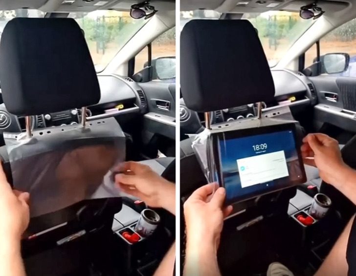 Закрепите файл при помощи подголовника и поместите в него телефон или планшет, чтобы отвлечь ребенка мультиками во время долгой дороги