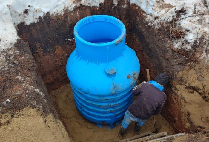 Конструкция из пластика похожа на вертикальный септик. Подобные кессоны изготавливаются из полимерных материалов повышенной прочности вроде полиэтилена, ПВХ и полипропилена и добавляют стекловолокно. Пластиковые конструкции обычно получаются цилиндрической формы с толщиной стенок 10-80 мм. У качественного кессона на корпусе располагаются ребра жесткости, которые компенсируют подвижки почвы. Подобные изделия весят легче всего — 70-150 кг. Одновременно это и плюс, и минус, поскольку конструкцию легко транспортировать, но она выталкивается из почвы. Из-за этого усложняется монтаж, а на пучинистом и подвижном грунте стоит делать бетонное основание с песчаной подушкой.