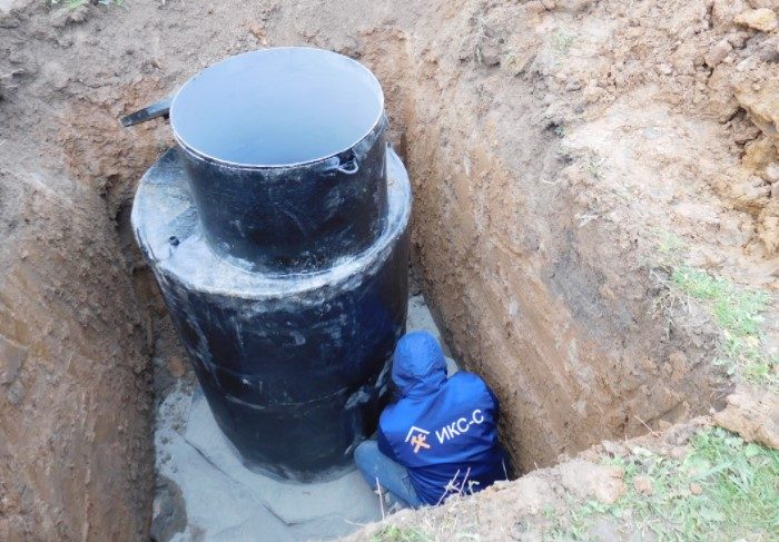 — бетон влагопроницаем, плюс через стыки между кольцами также может попадать вода. Поэтому с наружной стороны еще до засыпки котлована нужно делать гидроизоляцию;