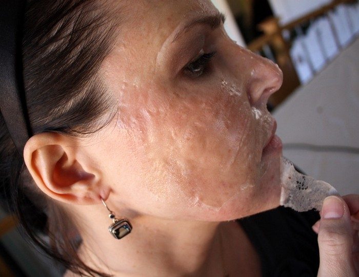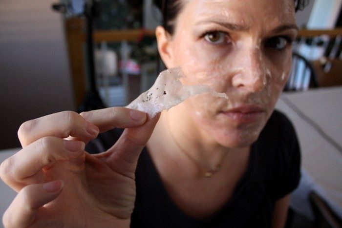 По истечению времени аккуратно потяните за край плёнки и начинайте её снимать. Скорее всего, одним слоем не получится, но не беда. Не удивляйтесь, когда на кусочках маски вы с удивлением обнаружите содержимое своих пор. Не очень эстетично, зато кожа скажет вам «спасибо».