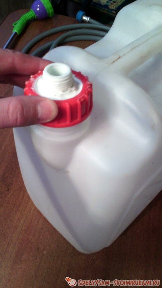 Собрав необходимые составляющие, снимаем крышку со сливной горловины пластиковой канистры. Важно: в дальнейшем, при использовании мини-мойки, канистру необходимо будет класть на бок, заливным отверстием вниз (для прямого выхода воды под давлением), поэтому крышку этого отверстия оставляем для стыка со шлангом. Толстым сверлом делаем в снятой крышке дырку.