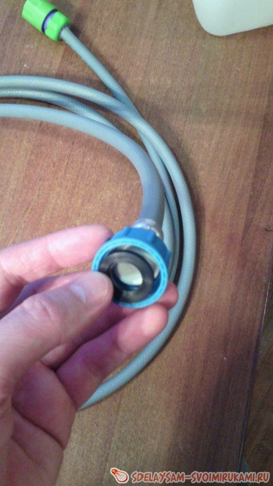 Во избежание выхода воздуха при подаче воды под давлением, во вторую гайку наливного шланга вставляем нужного диаметра резиновую прокладку.