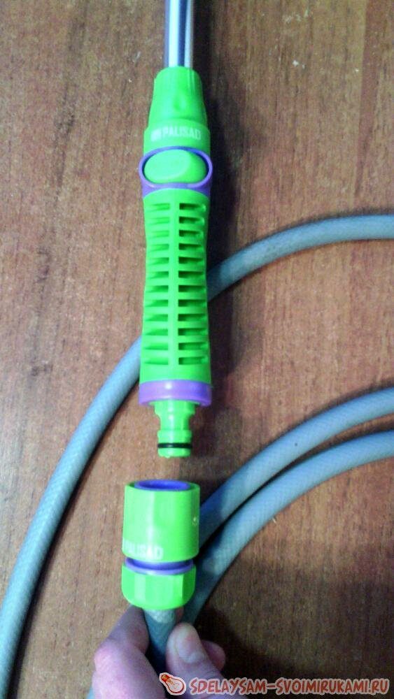 Накручиваем штуцер на поливочный пистолет на штанге.