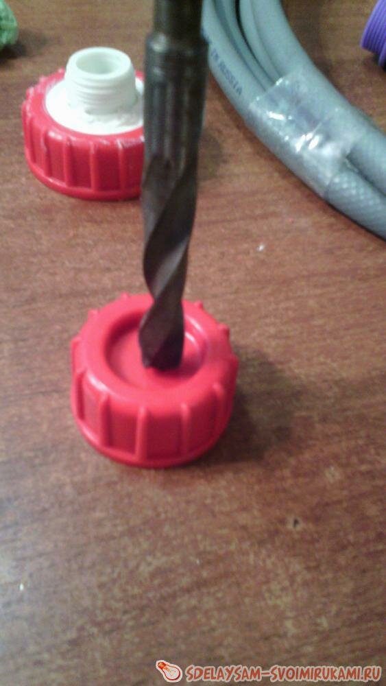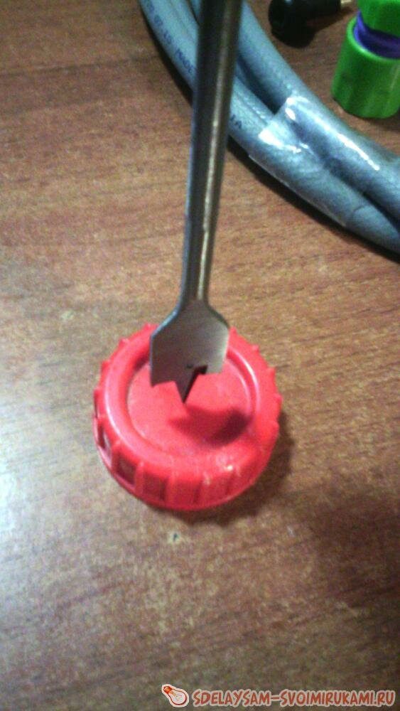 Снимаем со второго отверстия канистры крышку. Перьевым сверлом делаем в ней дырку, соответствующую диаметру соединительной муфты.