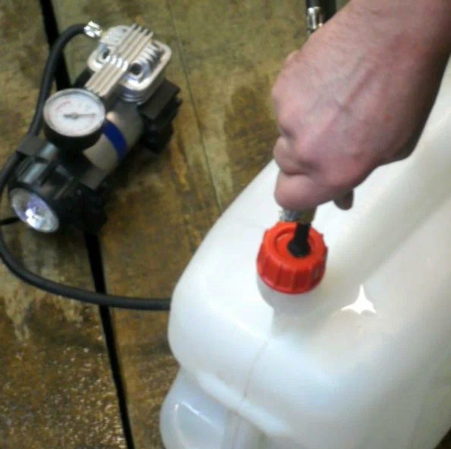 К вентилю подключаем автомобильный компрессор и накачиваем воздух (примерно 1 атмосферу, главное: не переусердствовать в накачке – может раздуть или разорвать канистру).