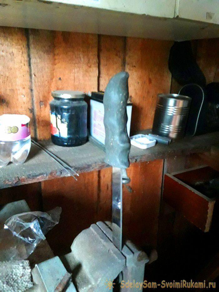 Плотно обжимаем, чтобы холодная сварка и штырёк лезвия изнутри имели как можно бо̒льшую площадь соприкосновения. Вытираем выступившие остатки секундного клея. Можно, при желании, также прилепить гарду и навершие рукояти, однако, это дело индивидуальное для каждого. Теперь зажимаем лезвие в тисках, рукоятью вверх, и оставляем на шесть-восемь часов. А лучше до следующего утра!