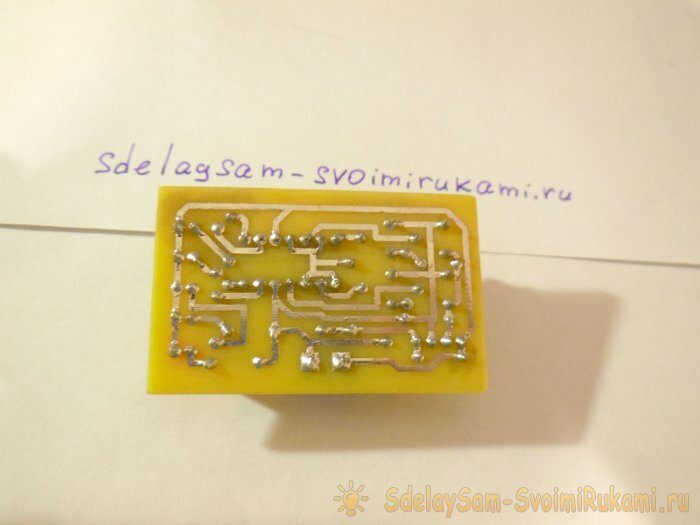Вся схема изготавливается на печатной плате размерами 35 х 55 мм. Изготовить её можно методом ЛУТ, что я и сделал. Несколько фотографий процесса: