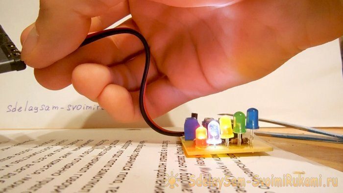 Отверстия сверлятся сверлом 0,8 мм, дорожки после сверления желательно залудить. После изготовления платы можно приступать к установке на неё деталей – в первую очередь устанавливаются перемычки и резисторы, затем всё остальное. Светодиоды можно вывести с платы на проводах, а можно и запаять в один ряд на плату. Для подключения проводов к аккумулятору лучше всего использовать сдвоенный винтовой клеммник, а микросхему желательно установить в панельку – тогда её можно будет заменить в любой момент. Важно не перепутать цоколёвку микросхемы LM317LZ, первый её вывод должен соединяться с минусом схемы, а третий с плюсом. После завершения сборки нужно обязательно смыть остатки флюса с платы, проверить правильность монтажа, прозвонить соседние дорожки на замыкание.