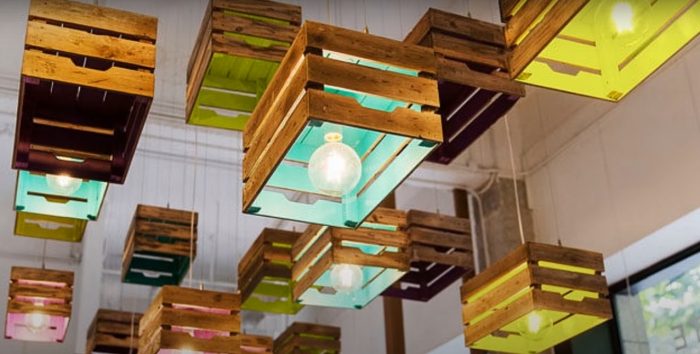 Деревянные ящики можно использовать даже в качестве своеобразных светильников. Для этого их нужно подвесить к потолку, а внутри разместить крупную лампу. Очень необычно такое решение будет смотреться, если внутри ящики покрасить в яркие цвета.