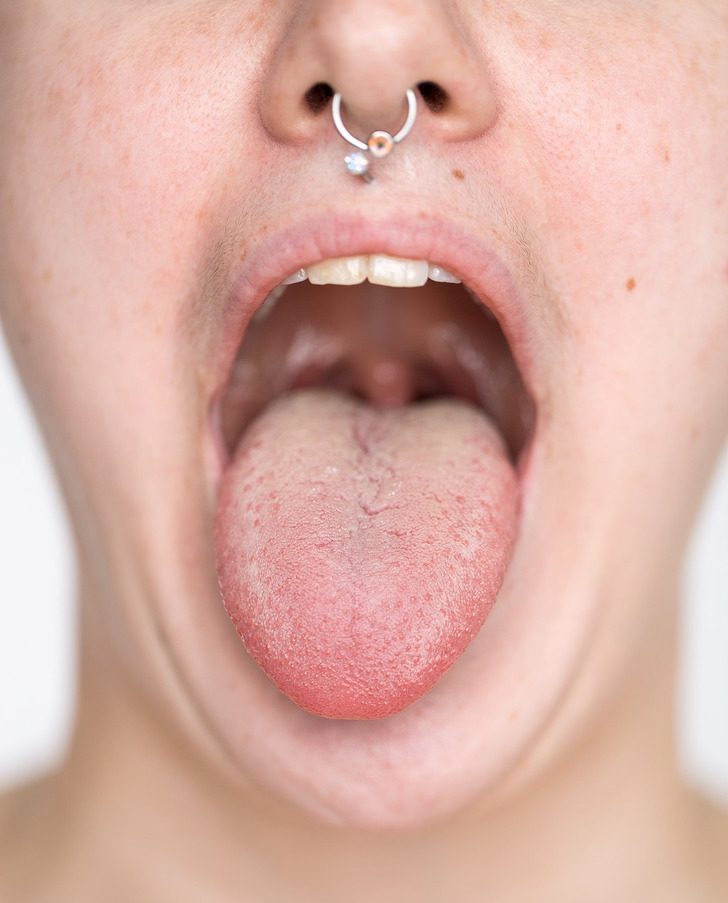 Сразу после прокола на языке можно увидеть белый налет. Это происходит из-за роста числа бактерий на его поверхности и является нормой. Избавиться от этого можно с помощью антибактериального ополаскивателя для полости рта. Кроме этого, можно обнаружить белое кольцо вокруг серьги пирсинга — это тоже является нормой и свидетельствует о том, что ткани языка заживают после прокола.
