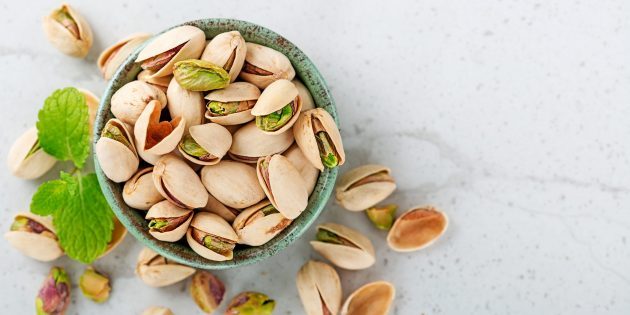 В 100 г очищенных фисташек — 10,3 г клетчатки. Кроме того, эти орехи — отличный источник белка: в тех же 100 г содержится до половины его дневной нормы.