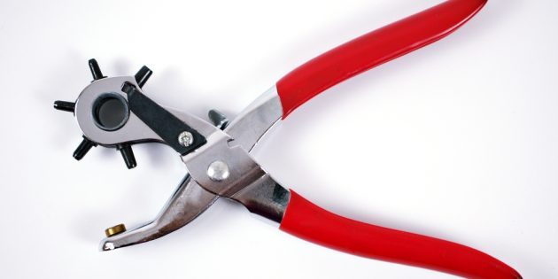 Инструмент представляет собой похожий на клещи дырокол. Как правило, у него есть режущие элементы разного диаметра, так что вы сможете сделать отверстие подходящего размера — чтобы оно не слишком отличалось от «родных» дырок. Если не получится определиться между двумя вариантами, выбирайте меньший.