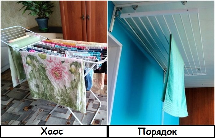 Придумайте, куда можно убрать эти вещи. Учтите, что вариант «посреди гостиной» не подходит. Сушилка должна быть стационарной – в ванной под потолком или на балконе. Если нет мокрой одежды, сложили одним движением и убрали с глаз долой. То же самое касается и гладильной доски. Самый лучший вариант – изначально купить встроенный вариант. Она может «выныривать» из комода, из-за зеркала или из недр кухонного ящика. В этом случае вы вряд ли будете постоянно держать ее разобранной.