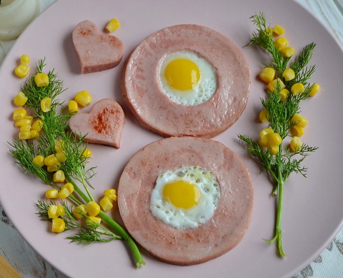 Вам понадобится два яйца, два ломтика вареной колбасы, один пучок укропа, две чайных ложки консервированной кукурузы, щепотка соли и растительное масло для жарки. Для начала яйца нужно вымыть в воде с содой, чтобы на скорлупе не осталось никаких загрязнений. Далее слейте с кукурузы жидкость и отложите в отдельную емкость необходимое количество продукта. Снимите с колбасы оболочку, отрежьте два кружочка и в центре выдавите с помощью небольшого стакана часть колбасы. Разогрейте сковороду, смажьте дно маслом и обжарьте колбасу с обеих сторон до золотистого цвета. Далее вбейте в центр по одному яйцу, посолите и жарьте до готовности. Из остатков колбасы можно вырезать сердечки с помощью формы для печенья и добавить их в готовое блюдо. После того как переложите яичницу на тарелку, украсьте ее кукурузой и укропом, имитируя цветение мимозы.