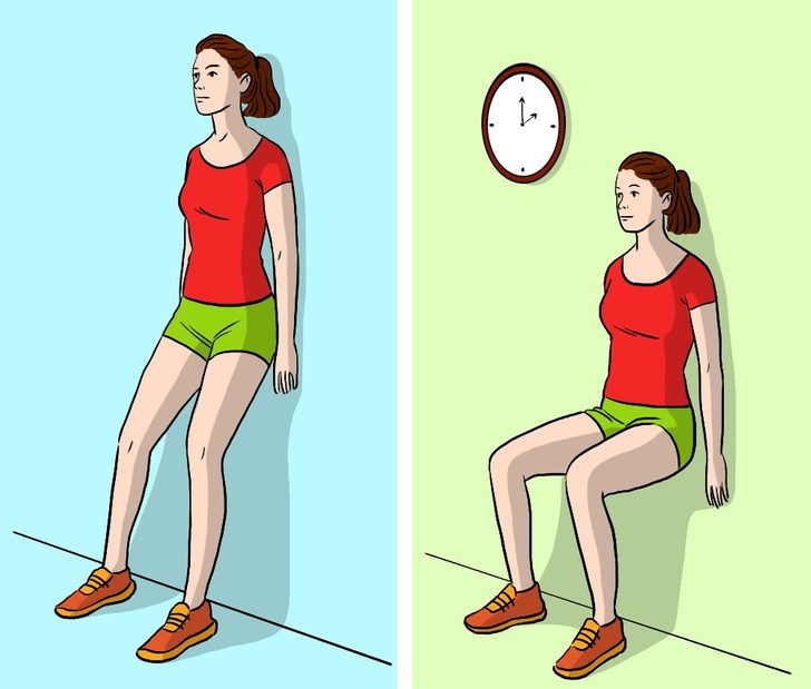 Медленно двигайтесь вниз, скользя спиной по поверхности стены до тех пор, пока бедра не будут параллельны полу, а угол в коленях не составит 90°.