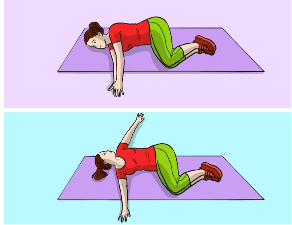 Лягте на бок, колени согнуты под углом 90°. Сложите руки перед собой.