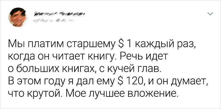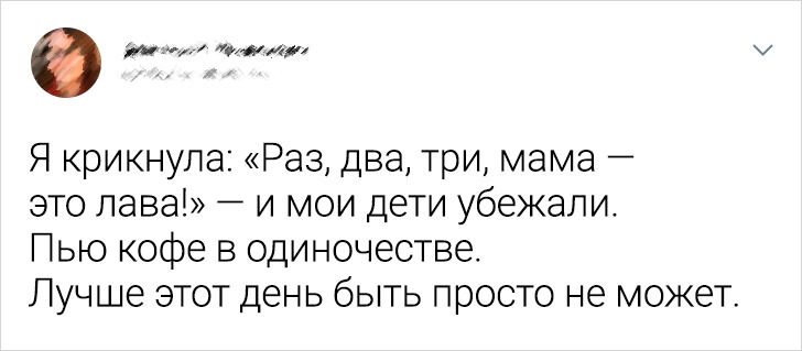 «Когда дети были еще маленькими, 3–4 года, я уводила их домой из бассейна или с детской площадки, используя следующий трюк. Вместо того чтобы кричать „Мы скоро уезжаем!“ — я говорила: „Еще 5 прыжков в бассейн, и идем собираться“».