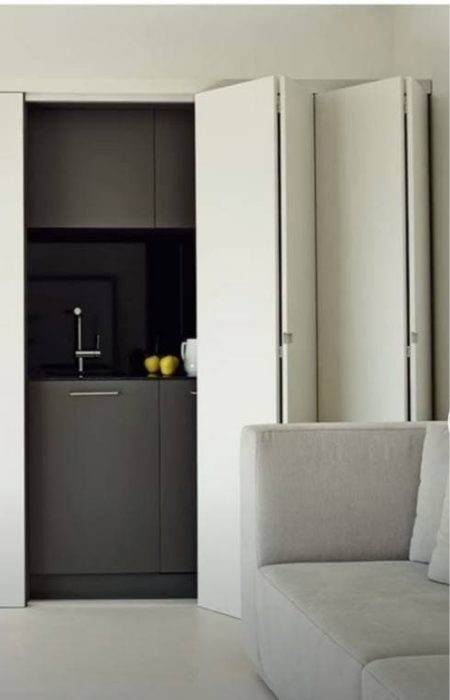Распашные двери-гармошки для скрытия кухонной секции, опять же, экономят место. За счёт того, что гармошек две, экономится место, которое так важно сохранить для небольшой квартиры, в то время как распашные двери требуют много пространства.