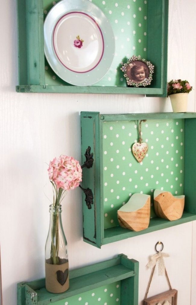 Вынув ящики из бабушкиного комода и покрасив их в нужный цвет, вы получите универсальные полки для кухни. Они станут подходящим дополнением к интерьеру в стиле прованс, кантри или шебби-шик.