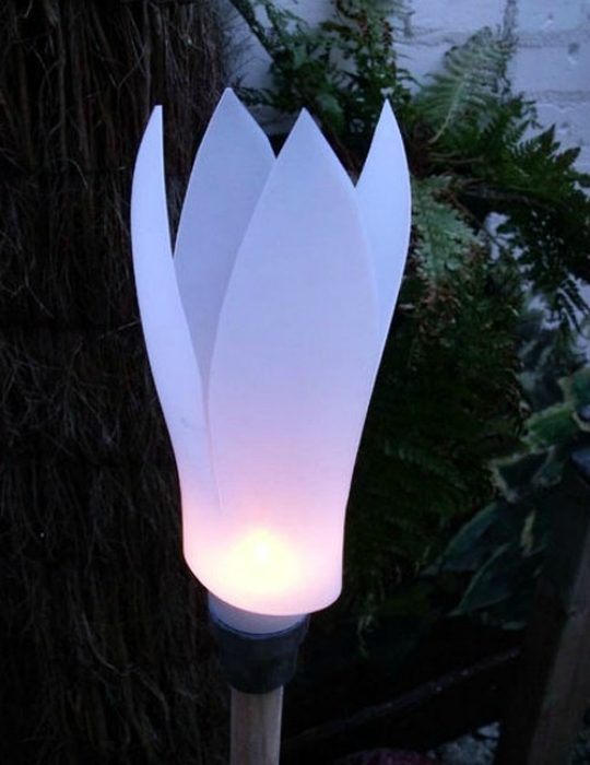 Элегантный садовый фонарь, похожий на цветок, можно сделать самостоятельно из деревянного бруска-штатива, пластиковой бутылки или канистры и обыкновенной лампочки.